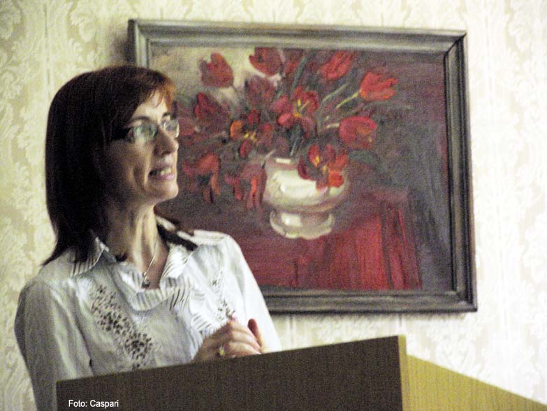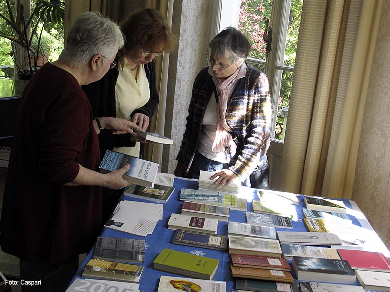 Dr. Liane Klein (links oben), Prof. Viesturs Vecgrāvis (rechts unten), Büchertisch