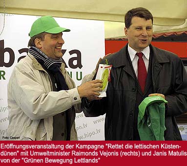 | Bereits 2007 wurde die Kampagne "Rettet die lettischen Küstendünen" gestartet - eine Konsequenz daraus, dass sich an der während der Sowjetzeit größtenteils abgeschotteten lettischen Küstenzone zwar sehr große Bereiche naturbelassener Flora und Fauna erhalten konnten, aber seit Beginn des Umbruchs Anfang der 90er Jahre nun neuen Bedrohungen ausgesetz sind. Manche verwechseln die neu erlangte Freiheit mit individueller Zügellosigkeit ("ich bin frei, jetzt darf ich alles"), und so ist die Ökologie der lettischen Küstendünen immer neuen Belastungen ausgesetzt. |