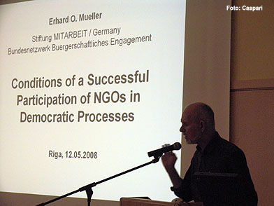Dokumentation & Eindrücke Montag, 12.Mai 2008 Vorstellung der Arbeitsgruppenthemen im Plenum (12.00 - 13.30 Uhr) Erhard O. Müller (Stiftung Mitarbeit, Deutschland): NGO Sustainability and Legislation Agnese Knabe (Civic Aliance Latvia): NGO Sustainability and legislation Andres Tarand (Estland): Climate change and energy Reetta Toivanen (Centre of Exellence in Global Governance Research, Finnland): Social inclusion and Human Rights Inta Ozola (Latvian Adult Education Association): non-formal education & lifelong learning Lutz Hüttel (FIDEA e.V., Deutschland): Cultural diversity |