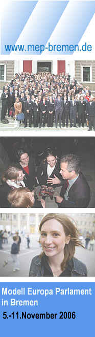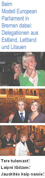 das Projekt MODELL EUROPA PARLAMENT - Baltic Sea Region Wir begrüßen vom 5.-11.November 2006 besonders herzlich die teilnehmenden Jugendlichen aus Estland, Lettland und Litauen We especially welcome the delegates from Estonia, Latvia and Lithuania and wish them a pleasent stay in Bremen! |